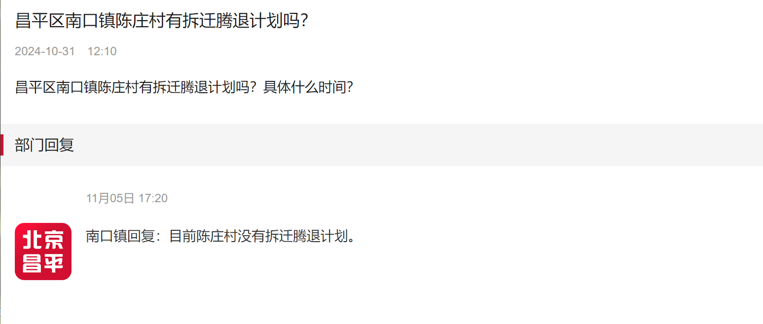 方兴建筑提示您,北京昌平公众号南口镇回复:目前陈庄村没有拆迁腾退计划。
